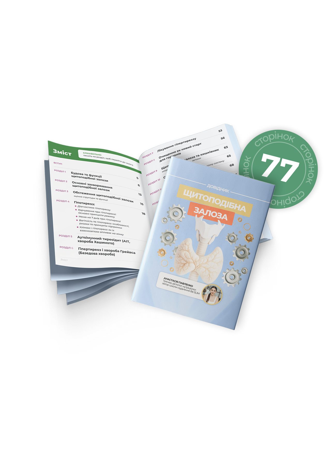 У книзі ви знайдете готові приклади меню та прості рецепти, які допомагають підтримати роботу щитоподібної залози, покращити травлення й повернути енергію.